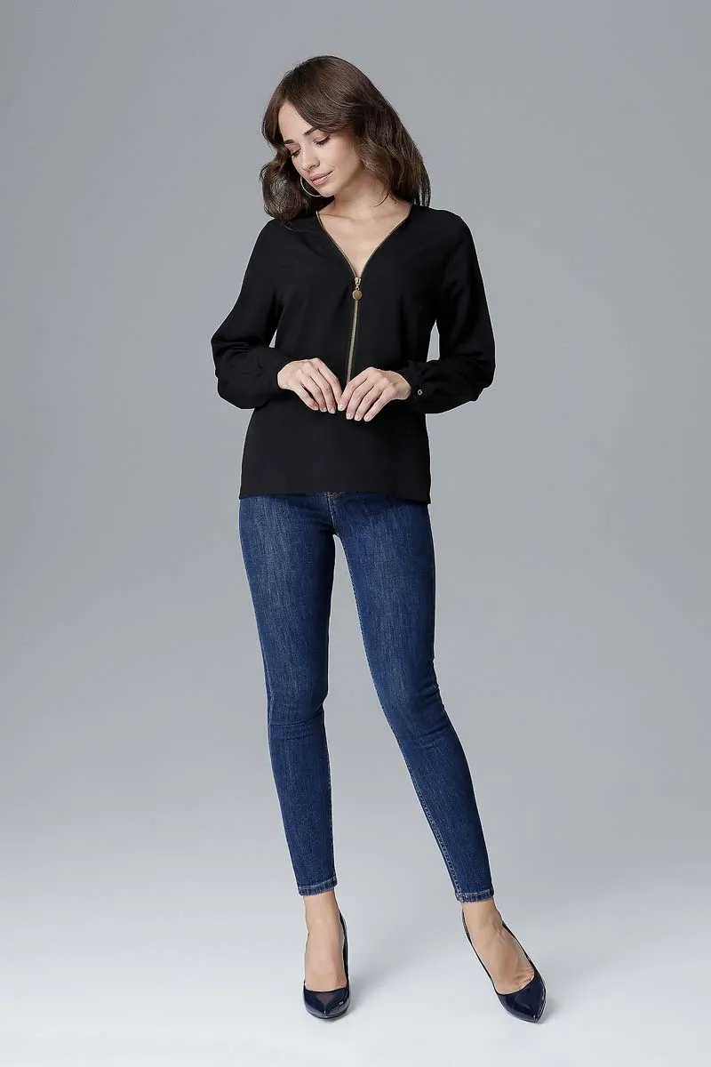 Czarna Prosta Bluzka z Suwakiem przy Dekolcie