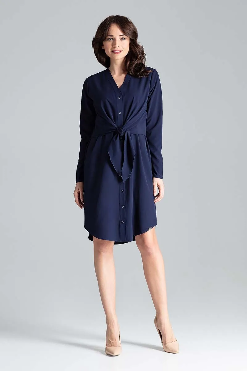 Granatowa Koszulowa Sukienka z Wiązaniem w Pasie