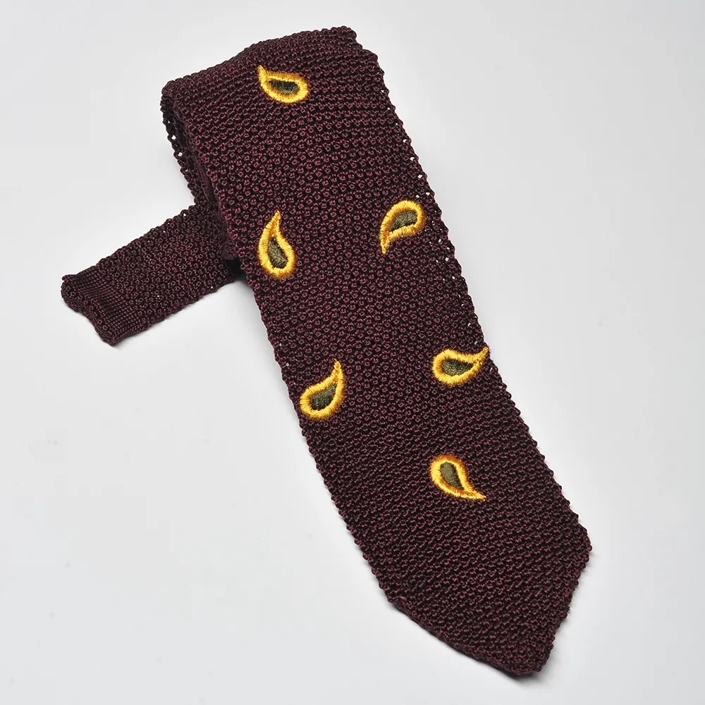 Bordowy krawat z dzianiny (knit) w żółty wzór paisley