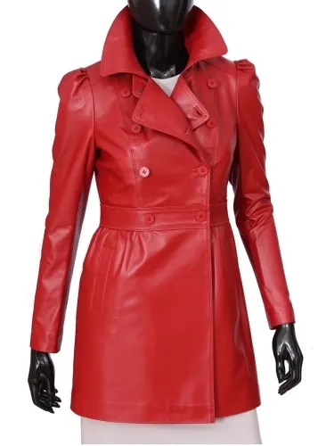 ELZ461 - czerwony płaszcz dwurzędowy damski ze skóry owczej DORJAN