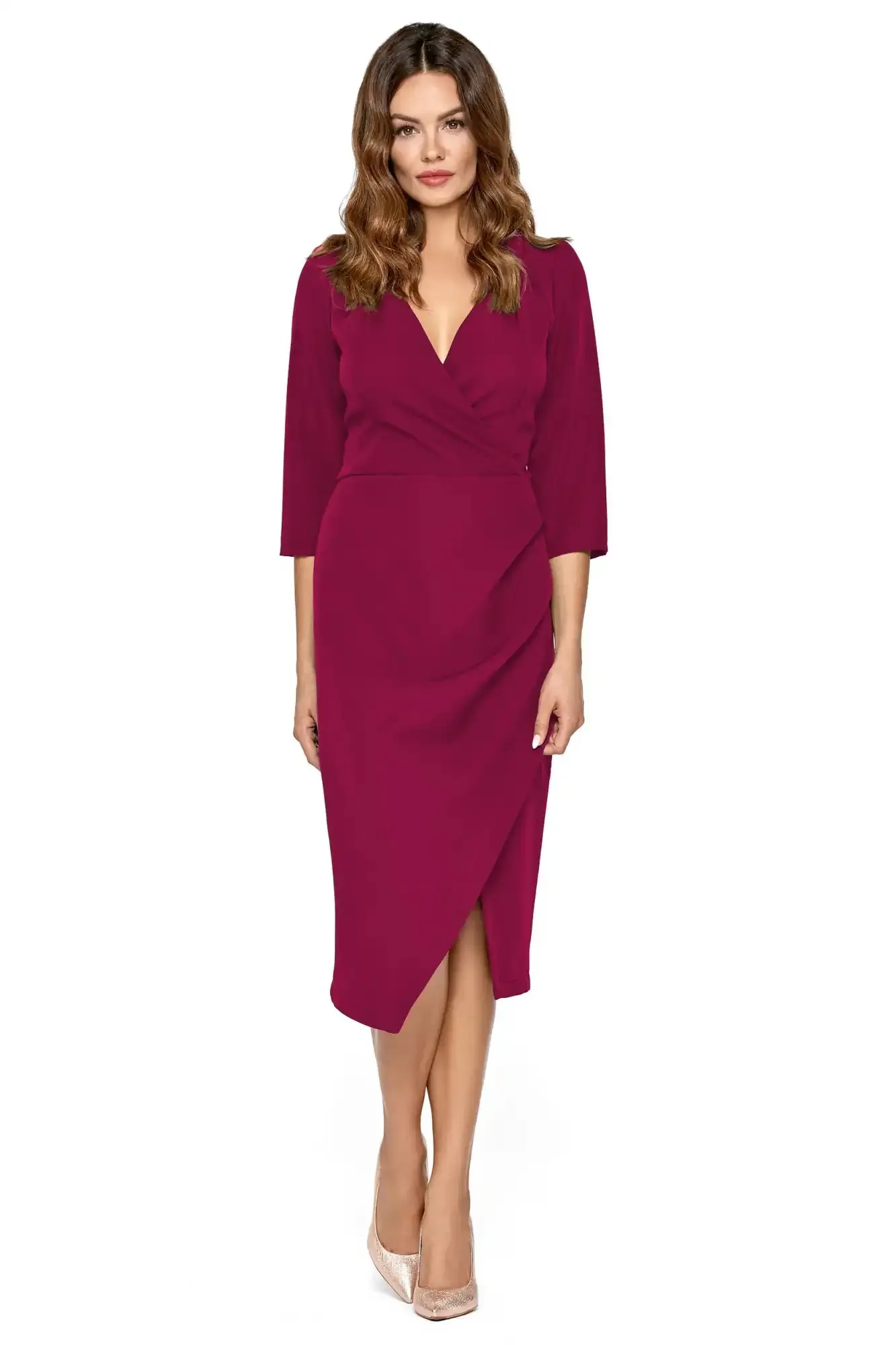 Wizytowa Sukienka z Kopertowym Dekoltem - Bordowa