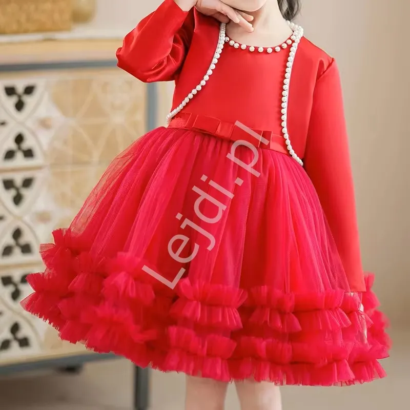 Komplet dziecięcy czerwona sukienka + bolerko z perełkami 2205