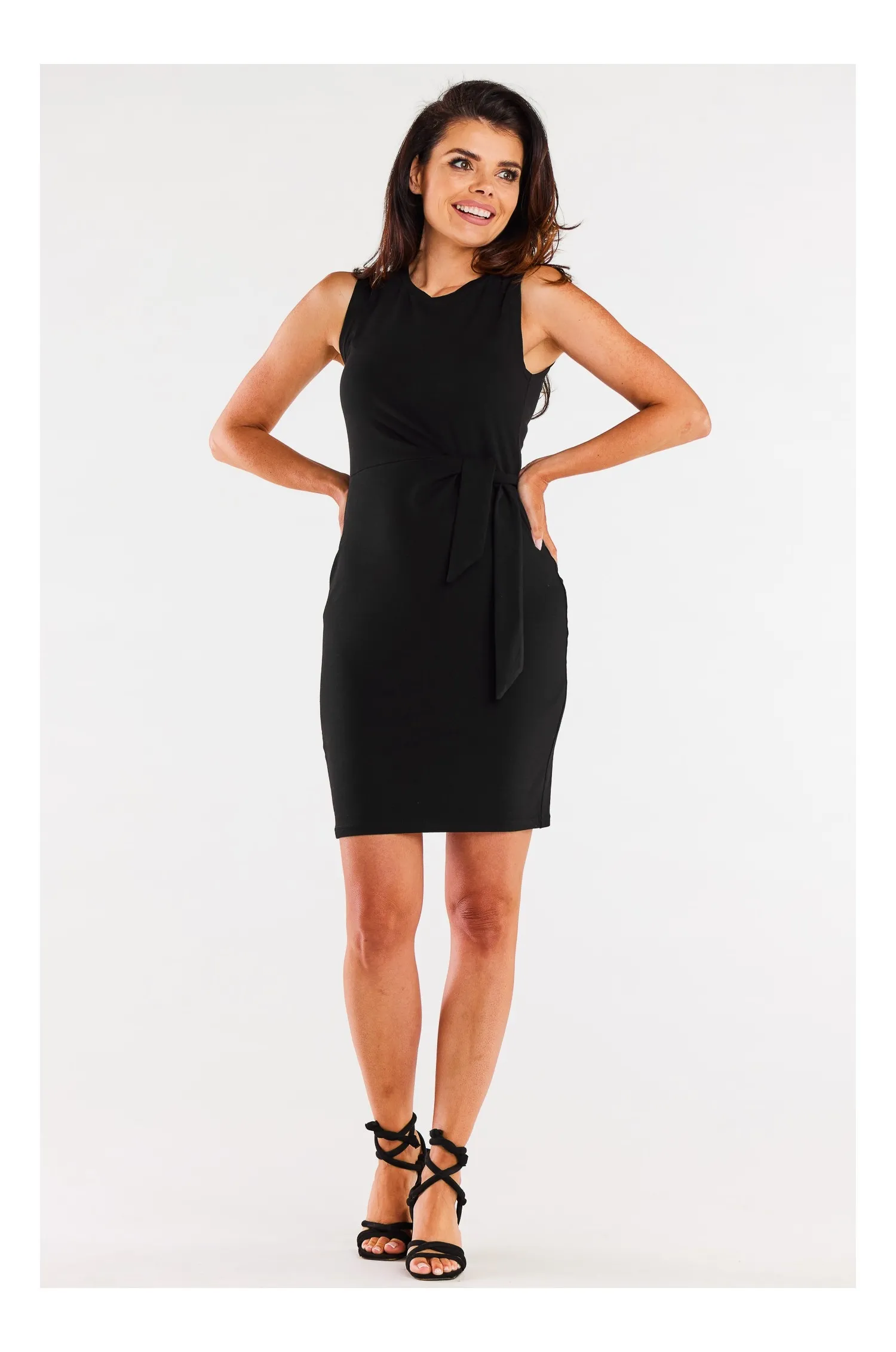 Czarna krótka sukienka z wiązaniem – zapewni Ci miłą dla oka oprawę i zaakcentuje urodę. Dopasowany krój doskonale podkreśli sylwetkę i nada właściwych proporcji. Sukienka bez rękawów ma gustowny, półokrągły dekolt. Stylowości dodaje jej fantazyjne wiązanie w pasie. Fason sprawdza się na różnych typach kobiecych sylwetek, a brak rękawa jest dobrym wyborem na lato. Sukienka sprawdzi się w duecie z sandałkami, w roli kreacji na wiosenne i letnie okazje. Modelka ma 172 cm wzrostu i nosi rozmiar S Materiał: bawełna 95% elastan 5%