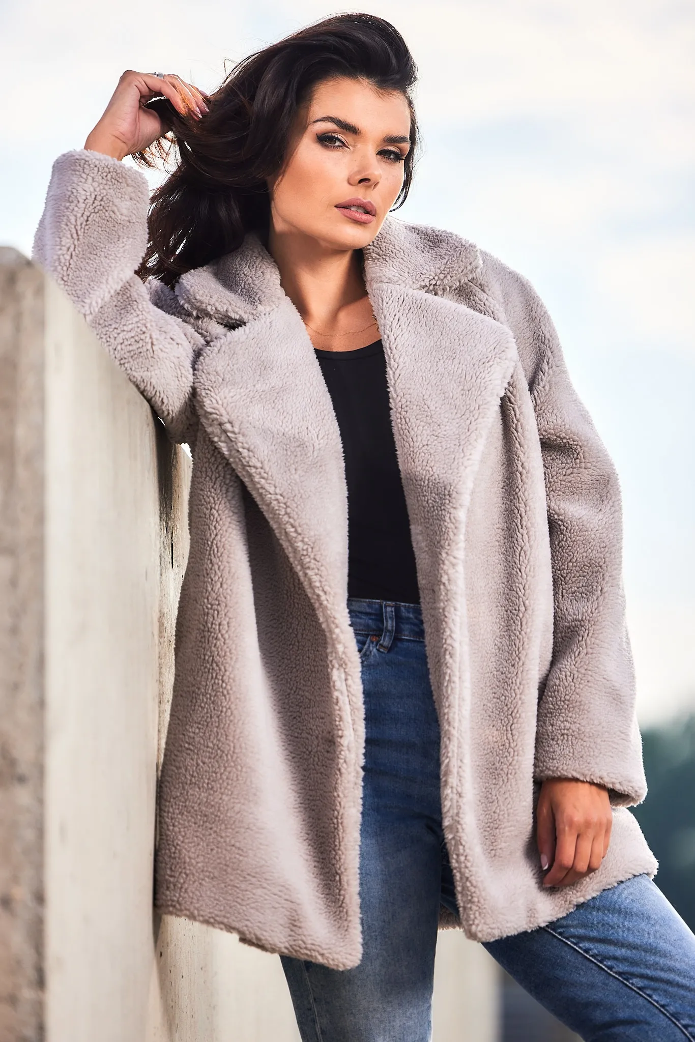 Krótki Płaszcz z Futerkowej Przędzy - Beżowy