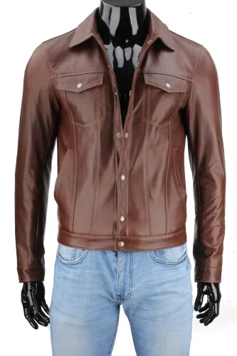 KTM122A - Brązowa kurtka skórzana męska o kroju jak kurtka dżinsowa DORJAN