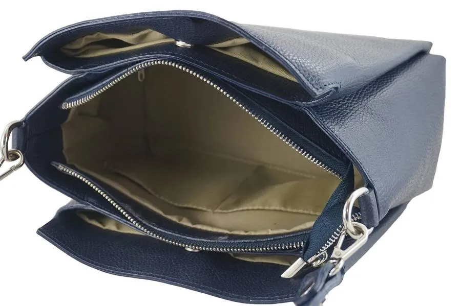 Wnętrze kuferka: trzy odrębne komory wykończone są podszewką. W środkowej, największej i zasuwanej, znajduje się mała zasuwana kieszonka i dwie otwarte mieszczące telefon oraz portfel. Dwie mniejsze komory zamykane są na zatrzask magnetyczny. Torebka kuferek na szerokim pasku jest zasuwana, posiada srebrne okucia, szeroki uchwyt (3cm) bez regulacji (długość 57cm, wysokość 28cm) oraz dodatkowy pasek z regulacją (maksymalna dł. 130cm, maksymalna wys. 65cm). Na spodzie znajdują się metalowe stopki chroniące przed otarciem.