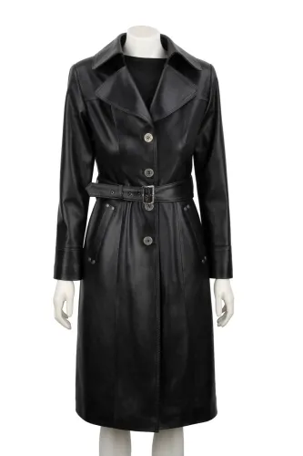 KRN450 - czarny jednorzędowy płaszcz skórzany damski z pasem DORJAN
