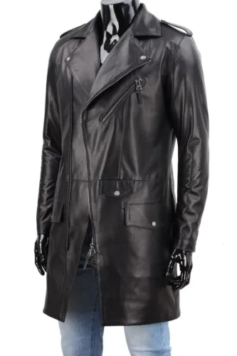 WIN450 - Dwurzędowy płaszcz skórzany męski zapinany na guziki z paskiem DORJAN