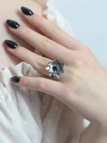 Kwiat lotosu z onyksem - pierścionek srebrny