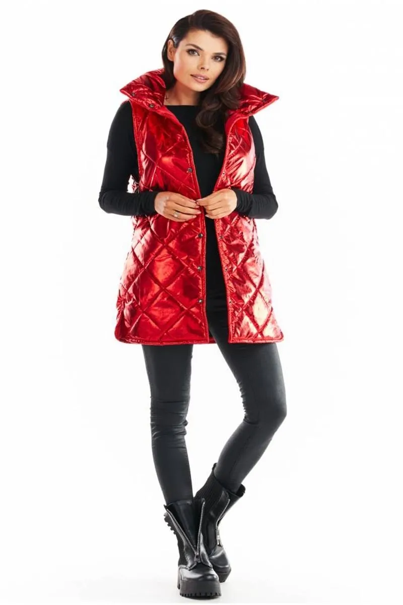 Czerwona lakierowana kamizelka z kołnierzem idealna dla kobiet, którzy docenią wygodę i designerskie rozwiązania w sportowym stylu. Pikowanie daje niepowtarzalny wygląd potęgując efekt miękkości. Lekka zapinana na napy, doskonale ochroni przed niskimi temperaturami. Na linii bioder wsuwane kieszenie. Model posiada wysoki kołnierz, dzięki któremu będziesz mogła zrezygnować z szalika. Pikowana kamizelka idealnie nadaje się na chłodniejsze dni. Modelka ma 172 cm wzrostu i nosi rozmiar S Materiał: poliester 100% podszewka: poliester 100%