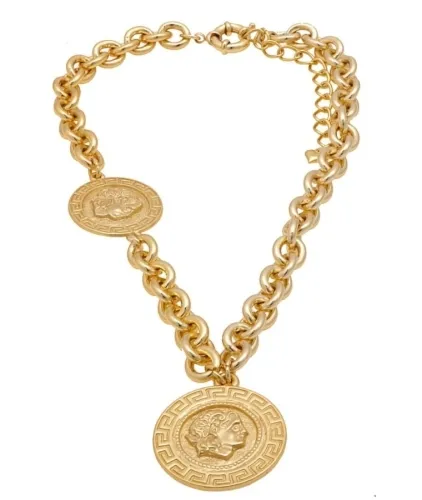 Łańcuchy są uwielbiane przez panie, które pragną nadać wyrazistości swoim stylizacjom. Łańcuch o długości 45cm + przedłużka 7cm. Monety o średnicy 3cm i 2,7cm. Łańcuch pozłacany.