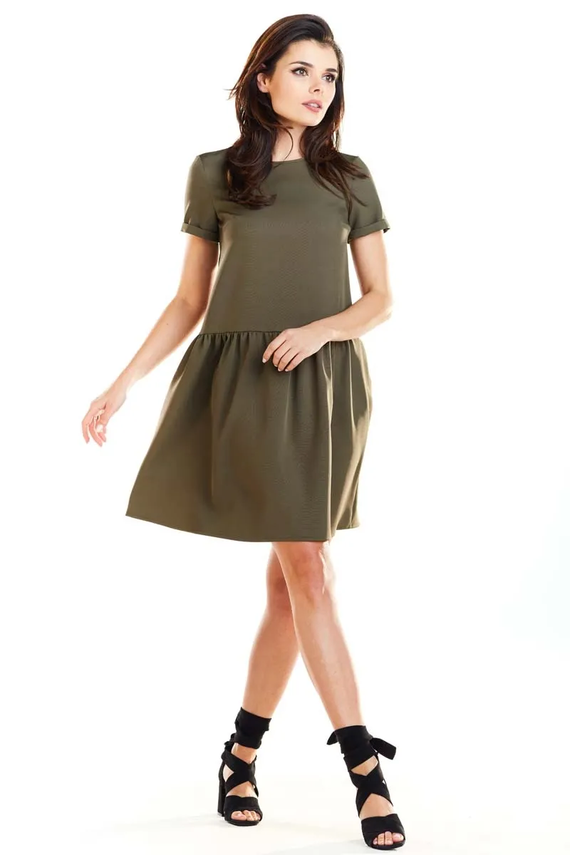 Khaki Letnia Sukienka z Marszczonym Dołem