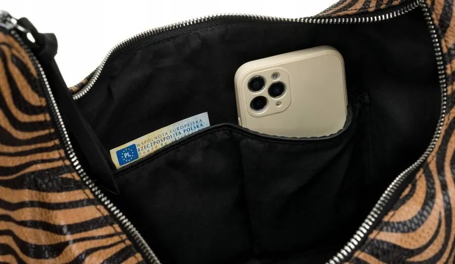 Odszyta z wysokogatunkowej skóry ekologicznej o ziarnistej fakturze. Zamykana dwoma zamkami magnetycznymi, a także zamkiem błyskawicznym. Ozdobiona złotym logo marki i stylową zawieszką. Wyposażona w 2 kieszenie wewnętrzne i 1 zewnętrzną.