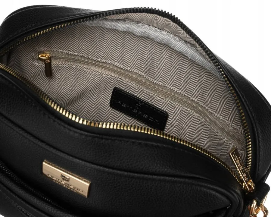 Starannie wykonana z wysokiej jakości skóry ekologicznej z groszkową fakturą. Cały środek wyściełany materiałową podszewką. Torebka dwukomorowa na suwak, wyposażona w 3 dodatkowe kieszonki. Torba na długim, logowanym pasku parcianym z regulacją.
