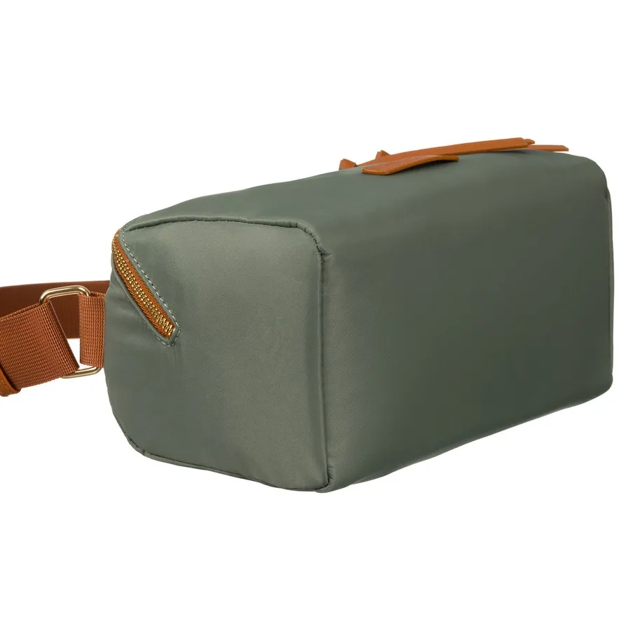 Listonoszka z nylonu i eko skóry w kolorach khaki i brązowym. Zamykana na suwak. Wyposażona w regulowany, szeroki pasek umożliwiający noszenie jej przez ciało. Posiada aż trzy kieszenie, w tym wewnętrzną na suwak i boczną.