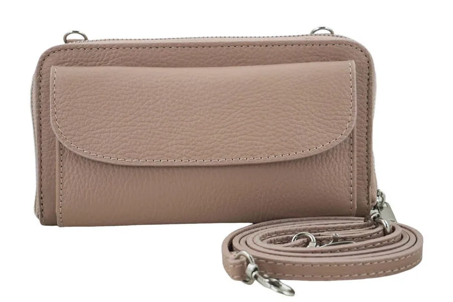 Wnętrze portfela/etui: portfel z etui na telefon ze skóry licowej posiada dwie odrębne strefy. W części na suwak znajduje się zasuwana kieszonka na monety, przegrody na banknoty oraz osiem miejsc na karty płatnicze, lojalnościowe, dowód osobisty i prawo jazdy. Portfel z etui na telefon ze skóry licowej posiada srebrne okucia, dużą kieszeń z przodu zamykaną na zatrzask (wymiary kieszeni: wysokość 9cm, szerokość 17cm, głębokość 1,8cm) oraz doczepiany i regulowany pasek (maksymalna dł. 121cm, maksymalna wys. 63cm).  Ofertę kierujemy do kobiet, dla których wygoda jest podstawowym kryterium w wyborze praktycznych rozwiązań do przechowywania dokumentów oraz telefonu, idealnych na zakupy, spacer lub np. jazdę na rowerze. Wygodny i praktyczny portfel z etui na telefon ze skóry licowej nie krepuje ruchów przewieszony przez ramię, jednocześnie będzie gustownym dodatkiem stroju zarówno casualowego jak i sportowego.