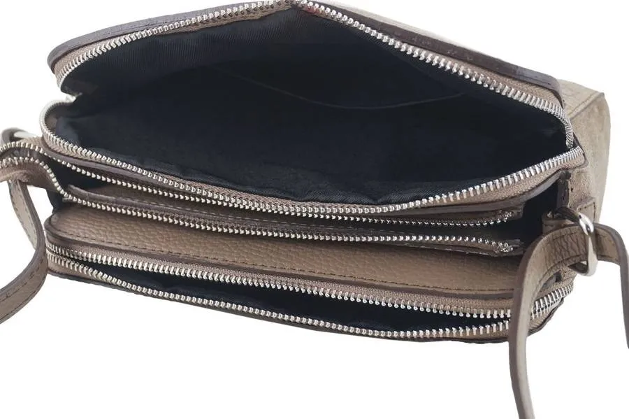 Wnętrze torebki: trzy odrębne komory są zasuwane i wykończone podszewką. W jednej znajduje się mała zasuwana kieszonka, w drugiej kieszeń otwarta mieszcząca telefon, niewielki portfel lub mały notes. Stylowa torebka crossbody trzykomorowa posiada srebrne okucia oraz długi regulowany pasek (maksymalna dł. 136cm, maksymalna wys. 65cm). Klasyczny fason zdobi zamszowa klapka oraz motyw zwierzęcy croco z przodu torebki.