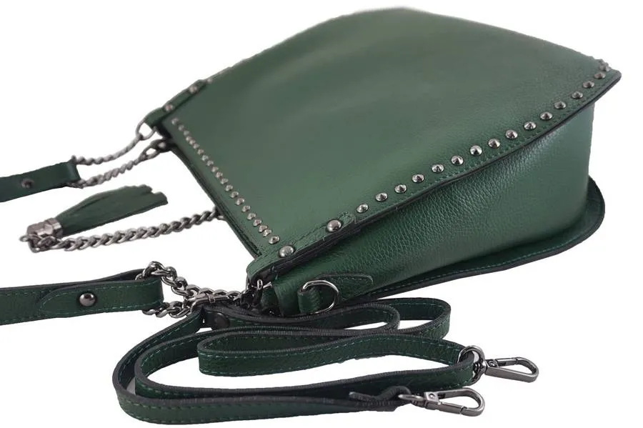 Modna torebka skórzana na ramię z nitami została wykonana ze skóry naturalnej licowej. Propozycja sklepu internetowego w kategorii Torebki Klasyczne – modna torebka skórzana na ramię z nitami, ze skórzanym frędzelkiem na łańcuszku oraz dodatkowym regulowanym paskiem. Ofertę kierujemy do kobiet dbających o modne stylizacje do pracy lub na spotkanie, poszukujących stylowych dodatków codziennej garderoby. Sklep internetowy oferuje listonoszki, worki skórzane, aktówki oraz torby męskie i portfele ze skóry naturalnej licowej oraz lakierowanej.