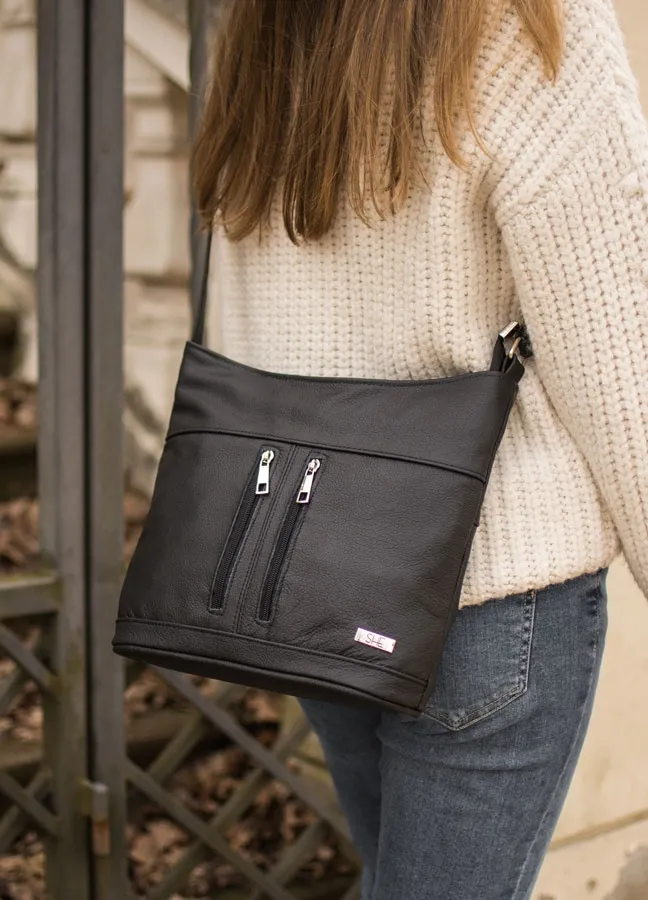 Listonoszka wykonana ze skóry naturalnej, wnętrze skrywa 1 komorę przedzieloną kieszenią na zamek oraz 2 kieszonki. Wymiary: wysokość -27 cm szerokość – 28 cm głębokość – 6 cm długość paska – 130 cm