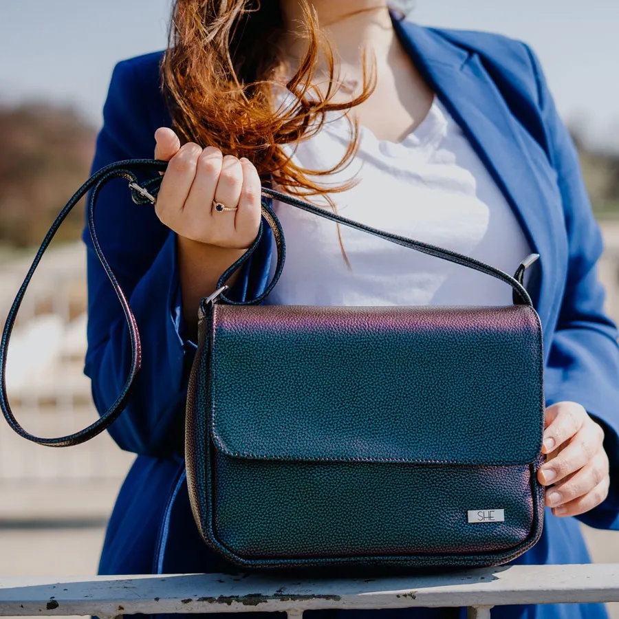 Elegancka torebka polskiej marki SHE wykonana z najwyższej jakości skóry naturalnej. Idealna na codzienne wyjście do pracy, na spacer, czy kolację. Wnętrze kryje 2 komory oddzielone przegrodą na zamek, dodatkowo posiada dwie kieszenie – na telefon oraz zamykaną na zamek. Wymiary: Wysokość – 27 cm Szerokość – 28 cm Głębokość – 6 cm Długość paska – max 140 cm