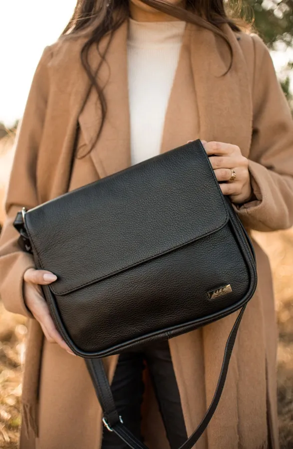 Listonoszka wykonana ze skóry naturalnej, marka SHE dba o najwyższą jakość swoich produktów. Wewnątrz torebka posiada jedną komorę oraz kieszonki – na zamek i otwartą. Model dostępny w kolorze czarnym. Wymiary: wysokość – 19 cm szerokość – 27 cm głębokość – 6 cm długość paska – max 145 cm