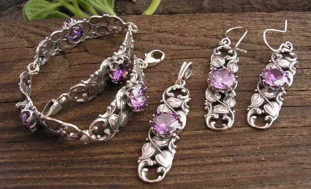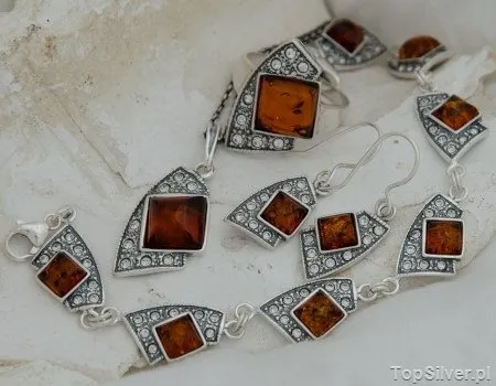 Komplet srebrnej biżuterii inspirowanej motywem roslinnym.W skład zestawu wchodzą: bransoletka, pierścionek, kolczyki zapinane na sztyft oraz wisiorek. W każdy element kompletu, który stanowi ażurowy listek wkomponowana jest syntetyczna perła. Długość bransoletki 18,7cm. Wymiar kolczyka 2cm x 1,8cm. Wymiar wisiorka 2cm x 1,8cm. Srebro próby 925.