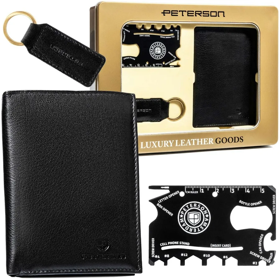 Elegancki zestaw prezentowy Peterson: portfel męski ze skóry naturalnej z ochroną RFID, praktyczna karta survivalowa z wieloma funkcjami i brelok skórzany. Portfel zawiera wiele kieszonek na karty, sekcje na gotówkę i miejsce na dowód rejestracyjny.