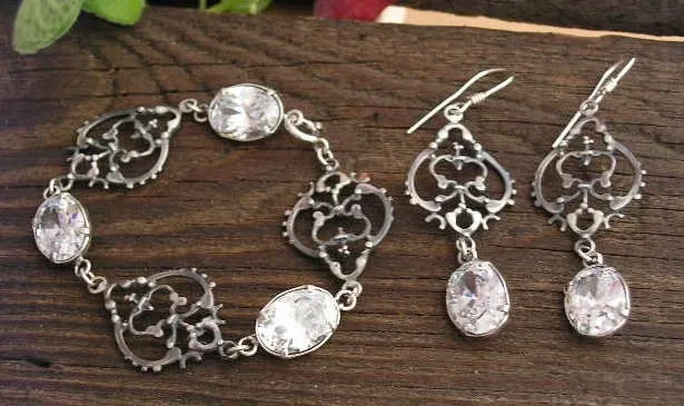 Stylowy zestaw biżuterii, który swój piękny wzór zawdzięcza rozkwitowi jubilerstwa w carskiej Rosji. W pojedyńczy, niepowtarzalny, iście królewski emblemat wkomponowane jest 5 akwamarynów(syntetycznych) oraz aż 12 pereł (syntetycznych)! W skład zestawu wchodzą: bransoleta, kolczyki, wisior oraz pierścień. Wymiar emblematu to 2 cm x 2cm. Srebro jest oksydowane. Próba: 925
