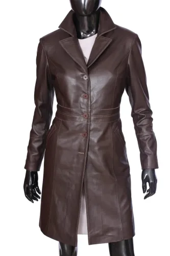 ELZ016 - brązowy dwurzędowy płaszcz skórzany damski vintage DORJAN