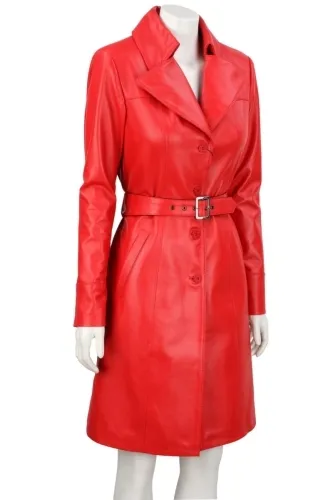 KRN462 - klasyczny czerwony płaszcz skórzany damski z pasem DORJAN