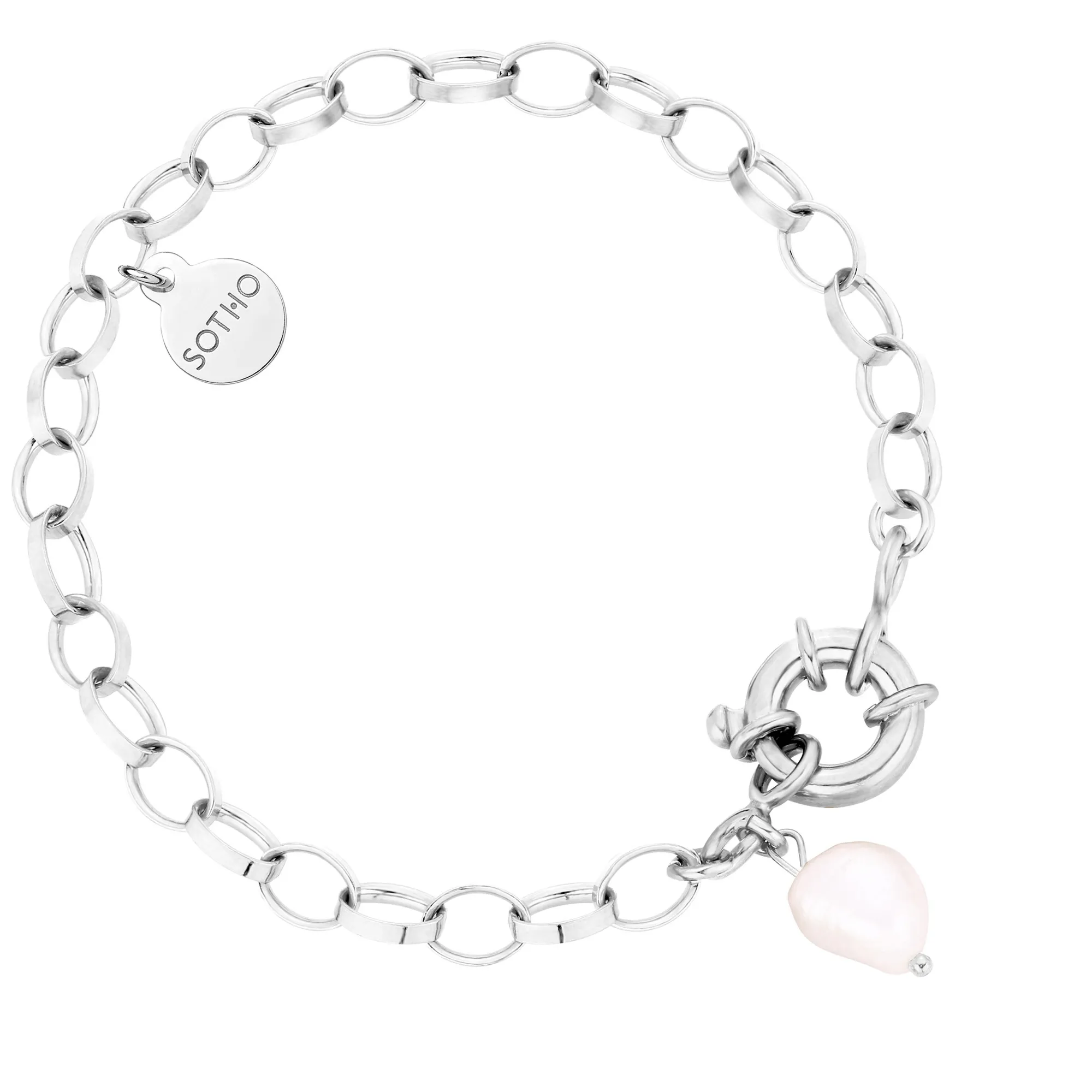 Srebrna masywna bransoletka z ozdobnym zapięciem i naturalną perłą