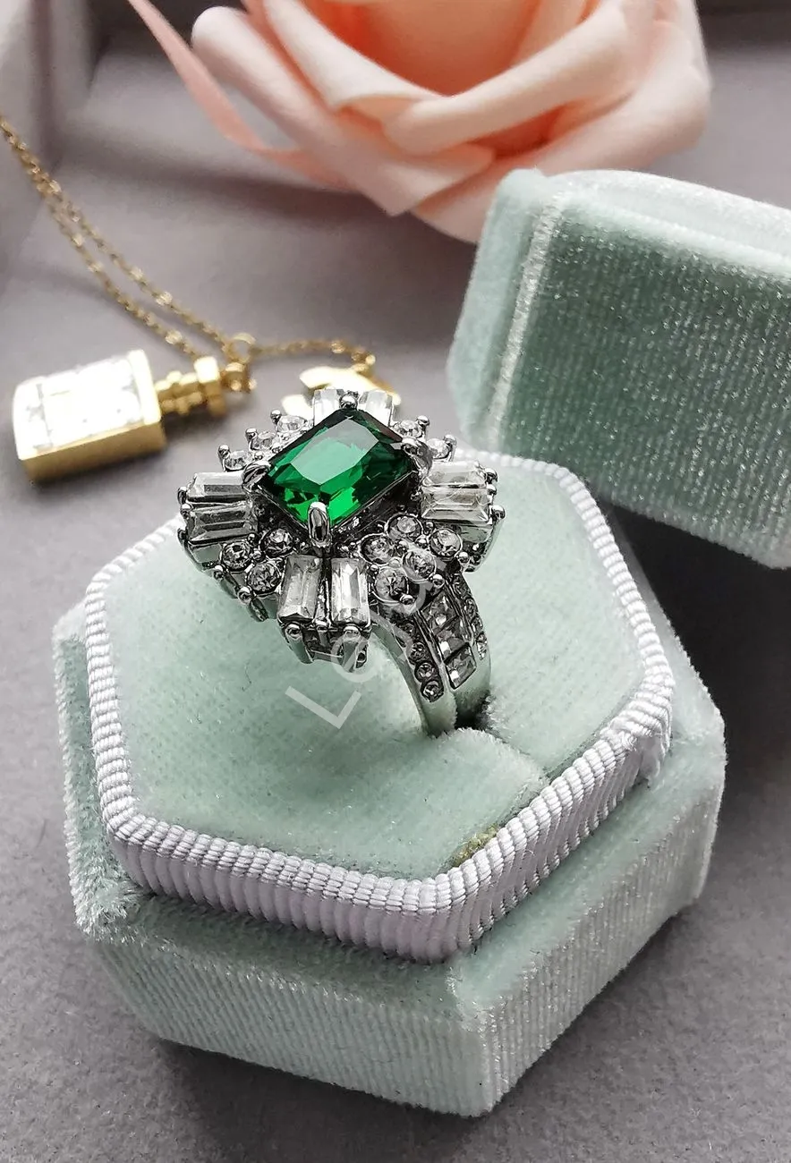 Kryształkowy duży pierścionek z zielonym oczkiem