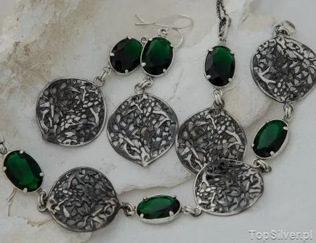 Wspaniały srebrny zestaw biżuterii (kolczyki i bransoleta), którego secesyjne, roślinne, wzory wykończono starą techniką włókninowania – nadającą srebrze satynowego powabu, całość doskonale uzupełniają naturalne kawałki drewna hebanu – najmodniejszego wśród celebrytów. Biżuteria wykonana została z dbałością o każdy szczegół. Szerokość motywu srebrnego to 24mm Wymiar hebanu to: 20x20x5mm Bransoleta: Długość z zapięciem to 17cm, Uwaga do zapięcia przymocowany jest srebrny łańcuszek który przedłuża bransoletkę do 21cm Kolczyki: Długość to 7cm Srebro: 925 W naszej ofercie znajdziesz także kolczyki oraz bransoletę do kupienia osobno. Kupując komplet oszczędzasz!