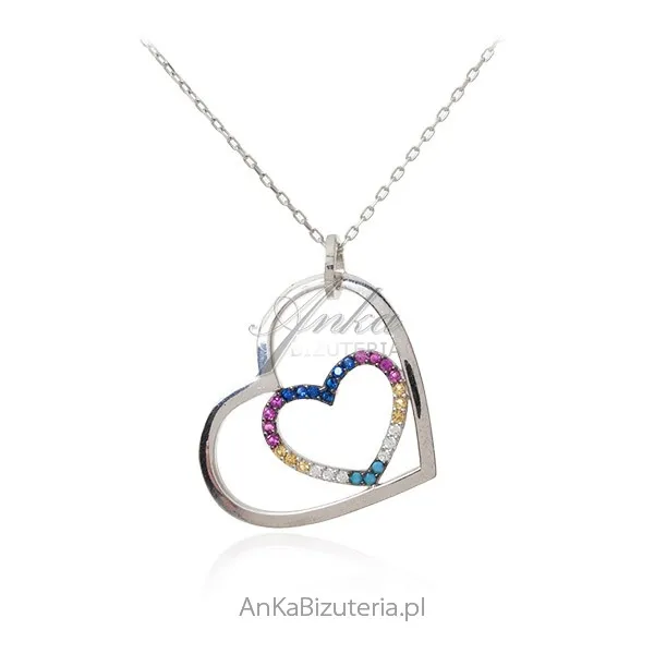 Srebrny naszyjnik serduszka z kolorowymi cyrkoniami