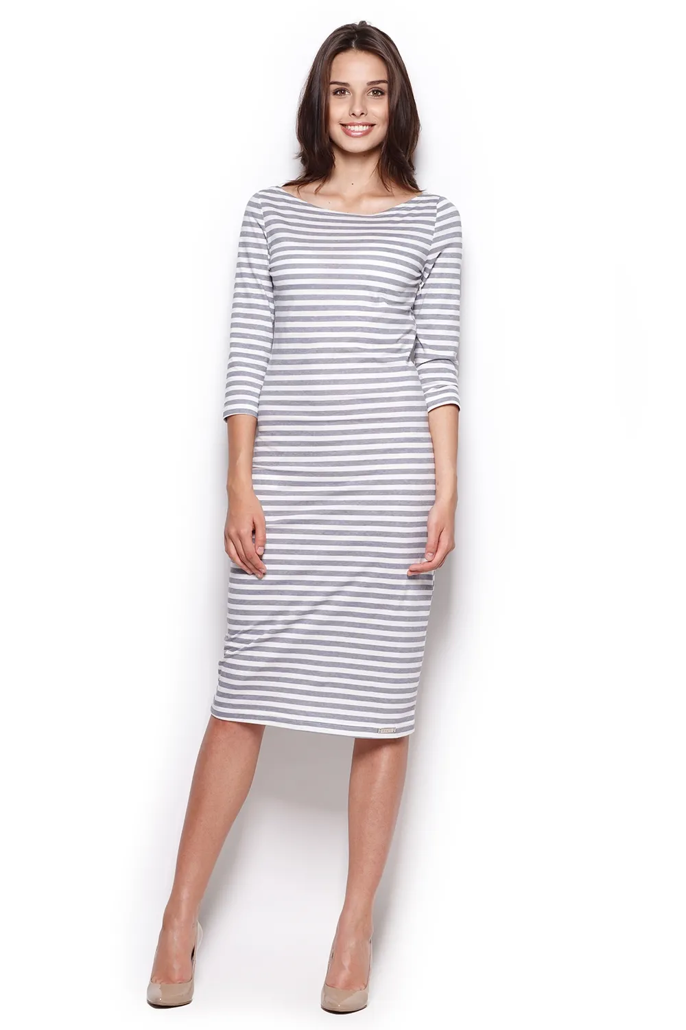 Pasiasta Midi Sukienka z Rękawem do Łokcia - Szary