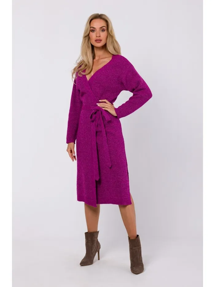 Midi sukienka z wiązaniem w talii - malinowa - Rozmiar: Uniwersalny