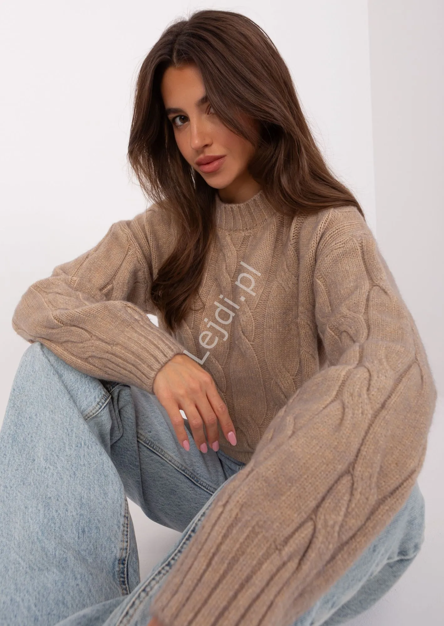 Jasno różowy sweter damski z warkoczami. Sweter damski na jesień i zimę o grubym pieknym splocie. Dekolt klasyczny, wykończony ściągaczami. Dostępny w wielu kolorach.