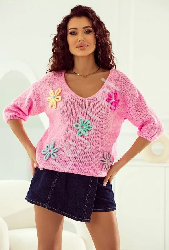 Różowy sweter oversize z kwiatkami Daisy Daze Polski Producent