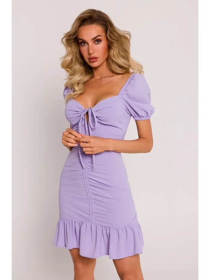 Oto propozycja fiołkowej sukienki, która wyróżnia się elegancją i subtelnym wdziękiem. Wykonana z wysokiej jakości tkaniny typu krepa, ta mini sukienka prezentuje się niezwykle stylowo i lekko. Jej dopasowany fason, ściągany na przodzie, podkreśla sylwetkę, jednocześnie zapewniając wygodę noszenia. Dekoracyjny dekolt z wiązaniem dodaje sukience charakteru i subtelnie podkreśla szyję. Dół sukienki zakończony falbaną nadaje jej lekkości i delikatności. Krótkie rękawy zakończone gumką dodają sukience uroku i sprawiają, że jest idealna na cieplejsze dni. Kryty zamek z tyłu zapewnia łatwe zakładanie i zdejmowanie sukienki, jednocześnie nie zakłócając jej eleganckiego wyglądu. Sukienka jest bez podszewki, co czyni ją lekką i przyjemną w noszeniu. Modelka prezentująca sukienkę ma 171 cm wzrostu i nosi rozmiar S, co świadczy o Uniwersalnym dopasowaniu fasonu. Zaprojektowane i uszyte w Polsce, ta sukienka to połączenie doskonałej jakości wykonania z modnym designem, który z pewnością przyciągnie uwagę każdej kobiety ceniącej elegancję i styl.