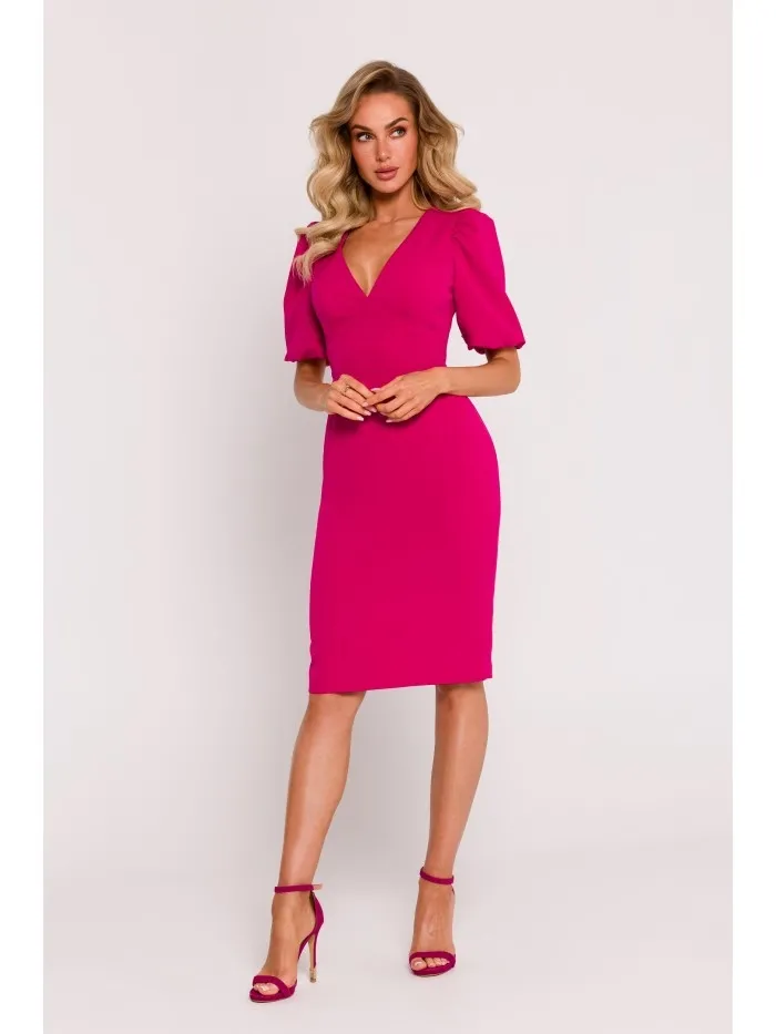 Przedstawiamy wyjątkową fuksja sukienkę taliowaną, która wzbudza zachwyt swoją elegancją i klasycznym stylem, idealna na wieczorne wyjścia czy specjalne okazje. Ta sukienka wykonana jest z wysokiej jakości tkaniny, która podkreśla jej luksusowy charakter i dopracowany wygląd. Jej gorsetowa góra na fiszbinach zapewnia doskonałe dopasowanie i podtrzymuje sylwetkę, nadając jej eleganckiego wyglądu. Głęboki dekolt w kształcie litery V dodaje sukience subtelnej zmysłowości, podkreślając szyję i dekolt. Krótkie bufiaste rękawy dodają lekkości i delikatności całej stylizacji, nadając jej niepowtarzalnego uroku. Dół sukienki, ołówkowy z mocno zaznaczoną talią, eksponuje kobiece kształty i dodaje klasy. Jego długość przed kolano nadaje sukience ponadczasowy wygląd, który nigdy nie wychodzi z mody. Ozdobny metalowy zamek z tyłu oraz rozcięcie z tyłu dodają sukience charakteru i wyjątkowego wyglądu.Sukienka nie posiada podszewki, co sprawia, że jest lekka i wygodna w noszeniu, idealna na cieplejsze dni.