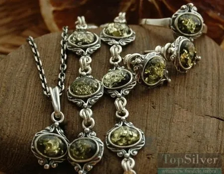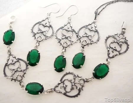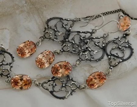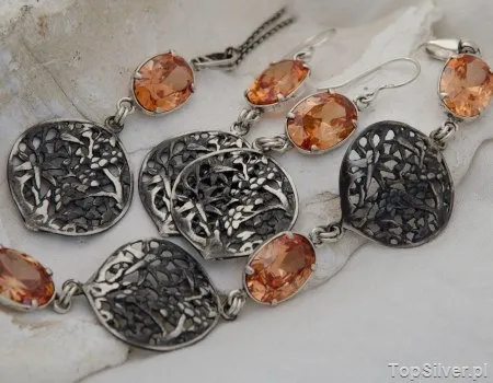 Wytworne zestaw srebrnej biżuterii, oksydowane elementy, w których niezwykle delikatny ażurowy wzór wkomponowano korale oraz kryształki Swarovskiego, sprawi że poczujesz się piękniejsza. W skład zestawu wchodzą: bransoletka, kolczyki, wisior oraz pierścionek. Biżuteria wykonana została z dbałością o każdy szczegół. Długość bransoletki to 18cm Wymiar motywu zdobniczego: 11 x 18 mm (wisior 15x24mm) Srebro: 925 Elementy z zestawu dostępne są także w ofercie osobno.