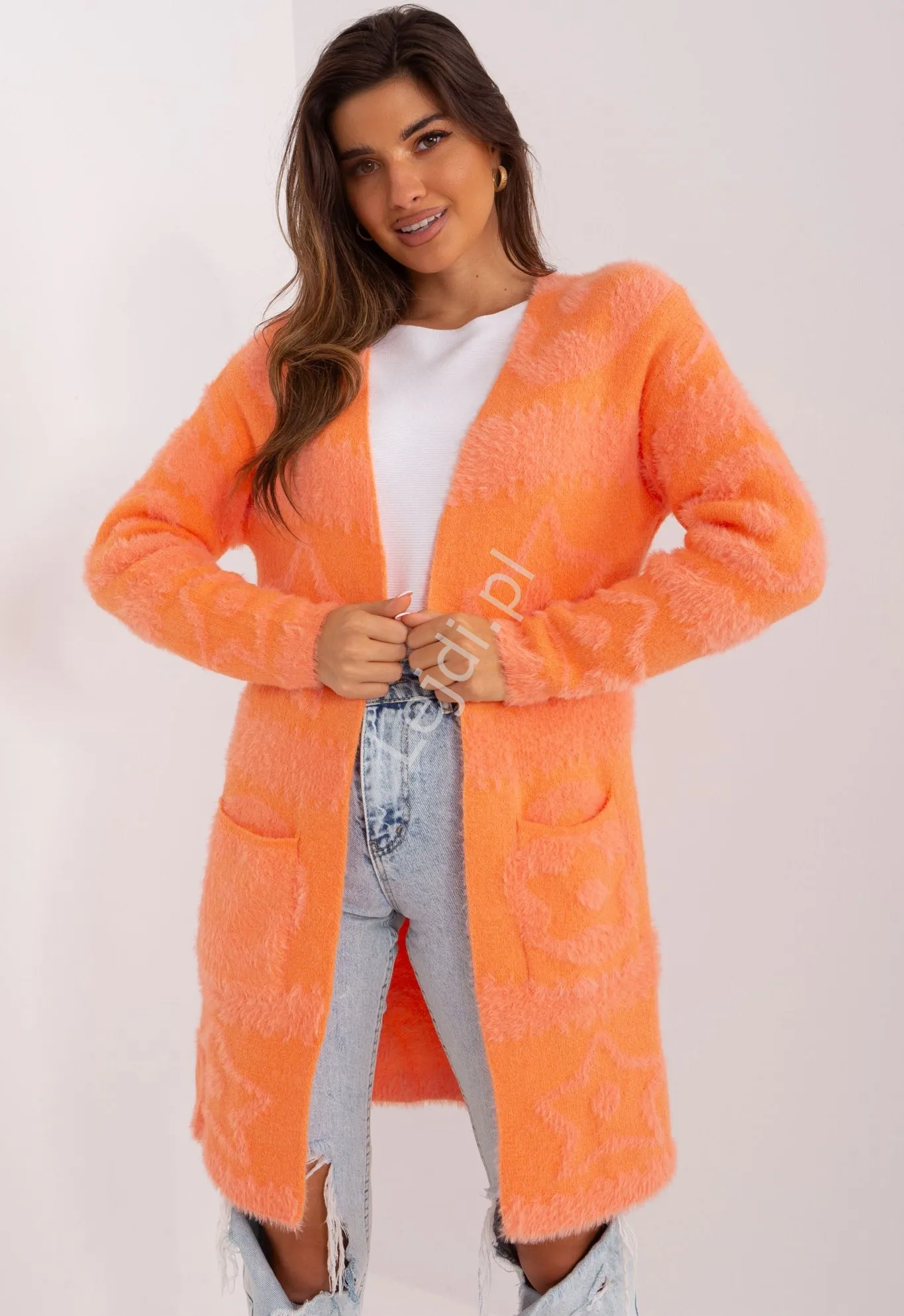 Uniwersalny musztardowy katdiigan damski. Miękka narzutka damska do noszenia na co dzień. Kardigan z jasnymiu wzorami koniczynki ala LV pięknie się prezentuje i pasuje do wielu stylizacji.