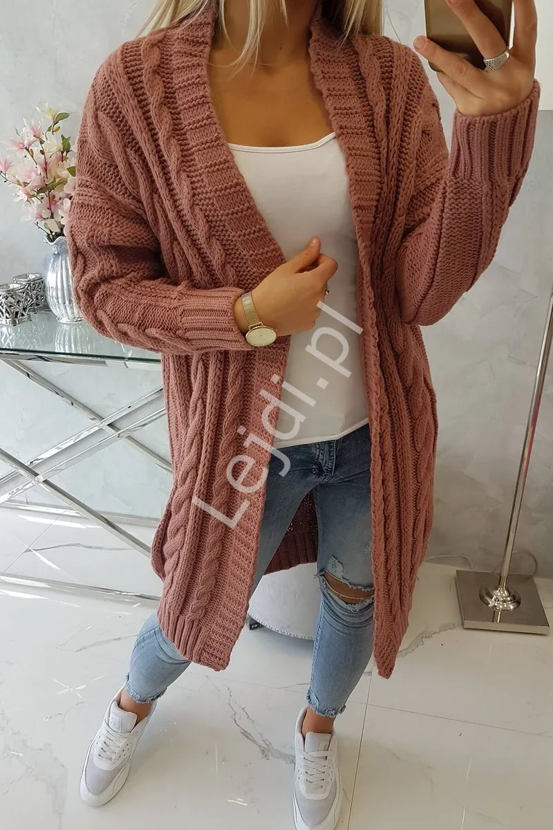 Narzutka damska z kapturem. Nie zapinany kardigan bawełniany w kolorze brzoskwiniowym. Piękna bluza z kapturem, na wiosnę, jesień.