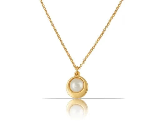 Pozłacany naszyjnik o splocie królewskim ze zdobiącą go perłą w szarym kolorze. Długość naszyjnika 46 cm + 7 cm przedłużki.