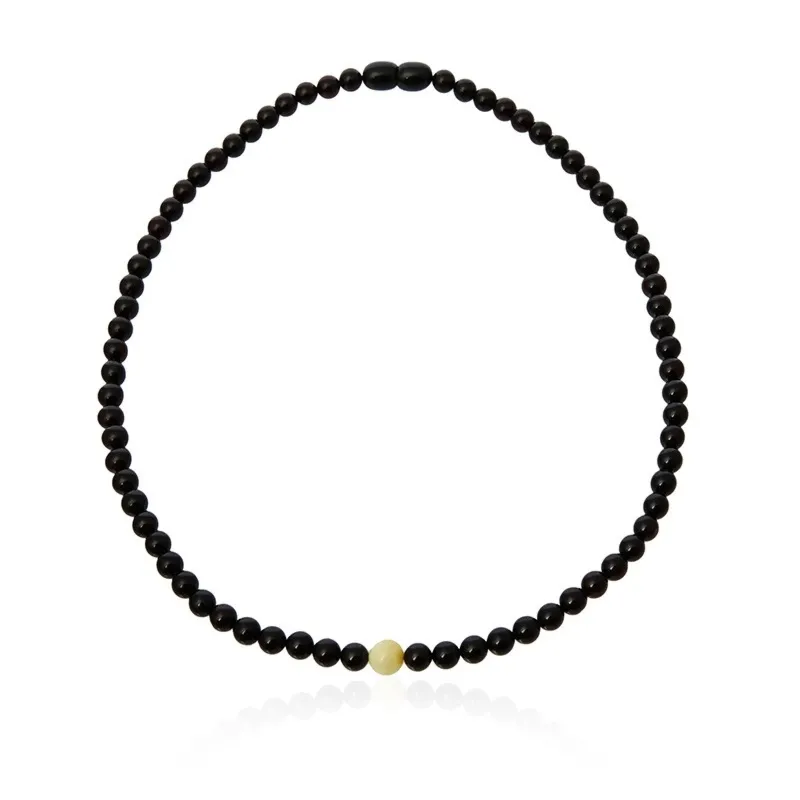 Naszyjnik srebrny - korale wiśniowe kulki bursztynowe z pojedyńczą żółtą kuleczką
