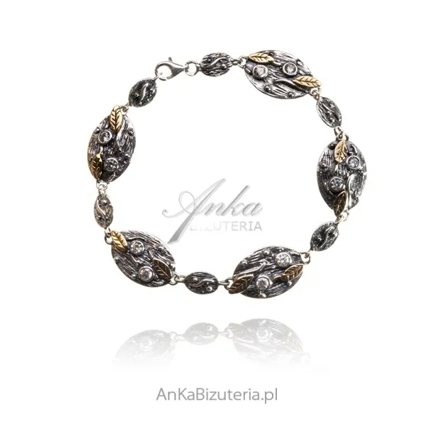 Bransoletka srebrna oksydowana i pozłacana z cyrkoniami foglia