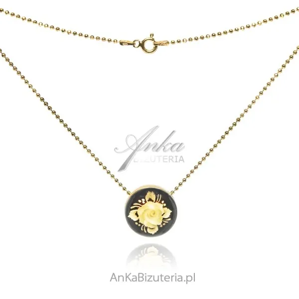 Piękny naszyjnik srebrny pozłacany z ręcznie rzeźbioną różą w bursztynie