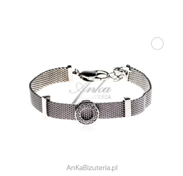 Bransoletka srebrna mesh kółko z cyrkoniami