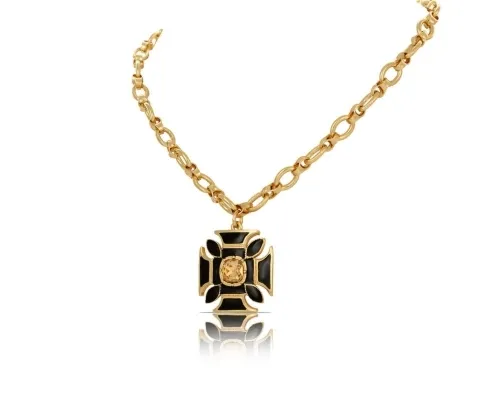 Naszyjnik pozłacany z onyksami i zawieszką symbolizującą krzyż maltański. Krzyż symbolizuje połączenie między niebem a ziemią, drzewo życia. Chroni przed negatywną energią. Długość naszyjnika 44,0 cm + przedłużka 7,0 cm. Wymiary krzyża 3,5 cm/3,5 cm. Waga naszyjnika 49,7 g.