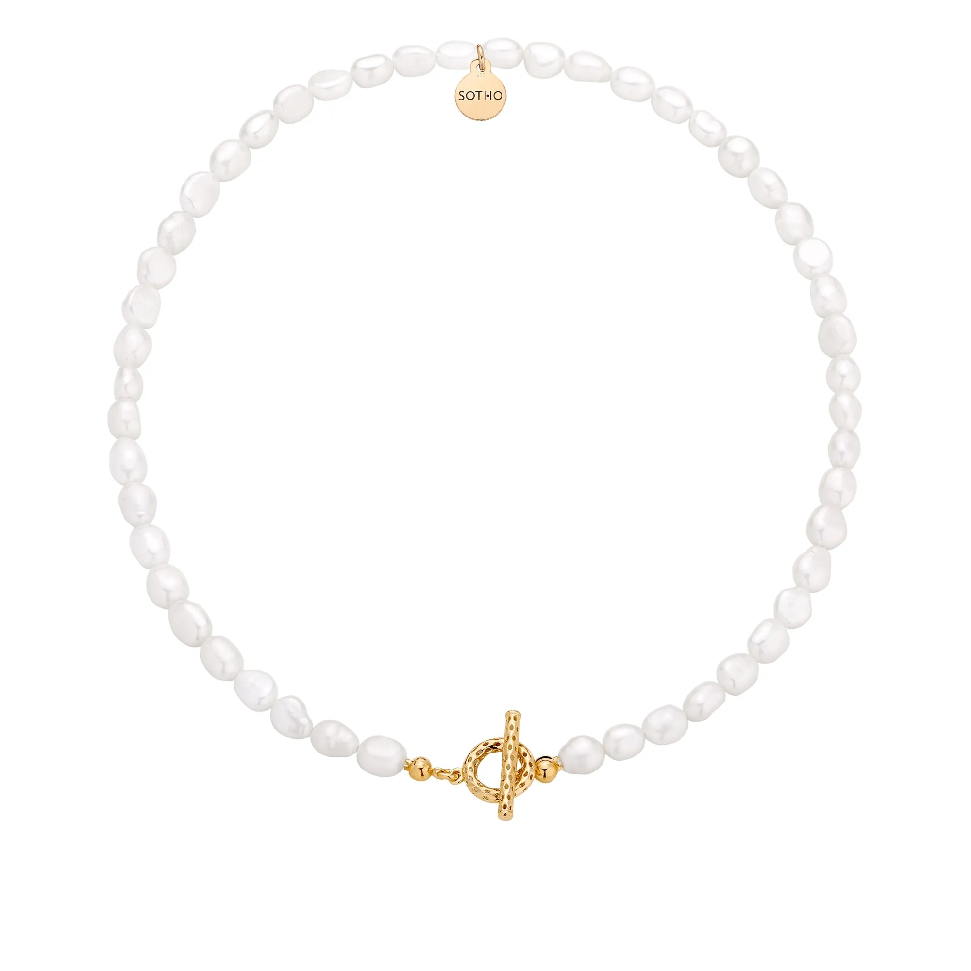 Złoty naszyjnik wykonany z naturalnych pereł słodkowodnych z ozdobnym zapięciem. Wszystkie elementy wykonane ze srebra 925 powlekanego 24 karatowym różowym złotem. Perły są nieregularne, unikatowe i mogą różnić się od tych na zdjęciu. Długość całkowita naszyjnika ok. 40 cmPerła 11 x 8 mm Ozdobne zapięcie: Kółko 10 mm Pałeczka 18 mm Zawieszka z logo 10 mm Produkt o wadze poniżej 5 g. Zapakowany w eleganckie pudełeczko z logo marki. Posiada logowana metkę. Istnieje możliwość zamówienia naszyjnika innej długości, z większą ilością zawieszek, z innym modelem zawieszki, z zawieszkami ze srebra 925 lub srebra 925 powlekanego 24 karatowym różowym złotem, z innymi perłami, kryształami SWAROVSKI® CRYSTAL, kamieniami itp.